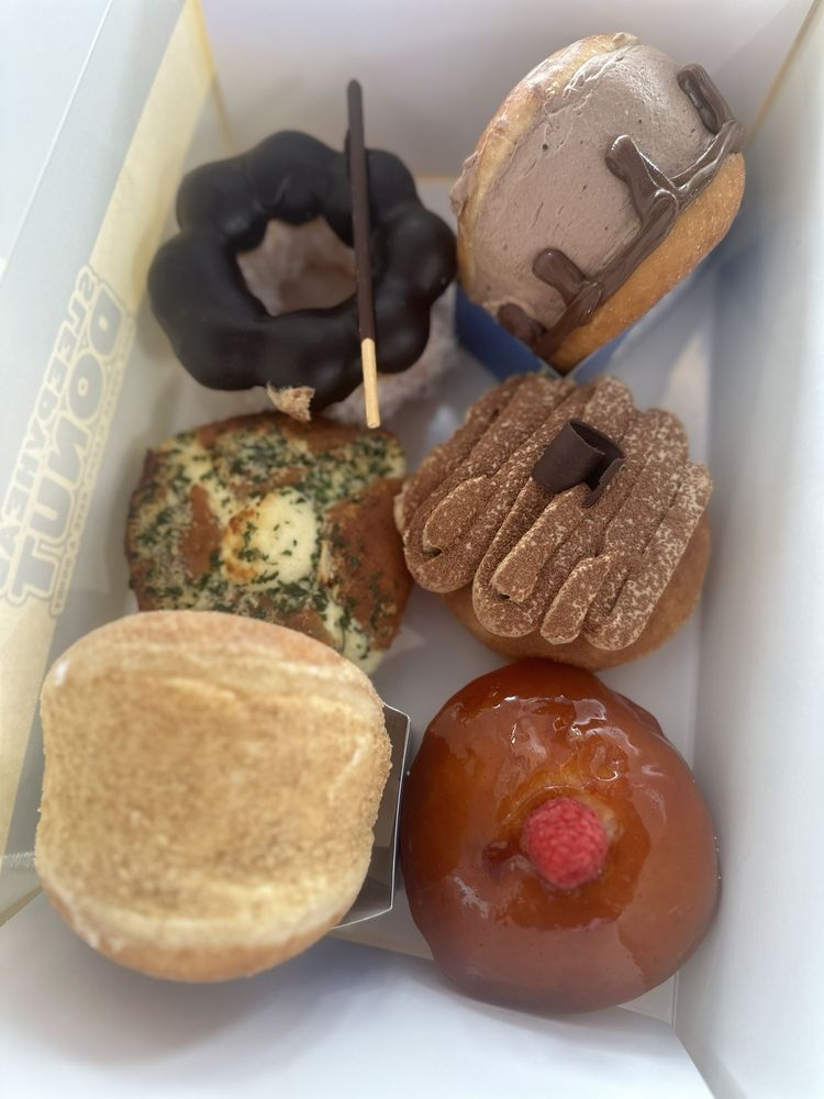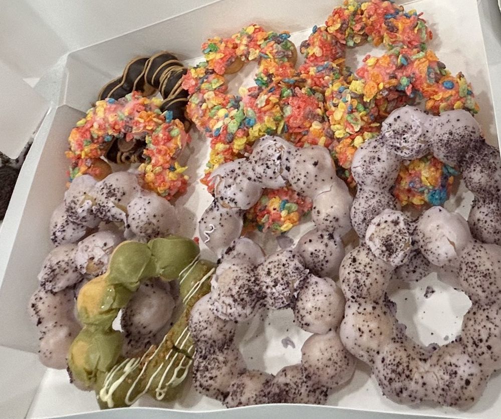 Glazed, Strawberry, Ube, Honey Lemon, Coconut, Matcha, Fruity Pebbles, Oreo, Pocky, Cafe Mocha, Choco Peanut, Birthday Cake, Cookie Monster. Choose six.