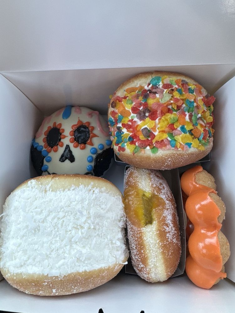 Mango milk cream donut: Soft donut filled with mango cream and topped with a light milk glaze.