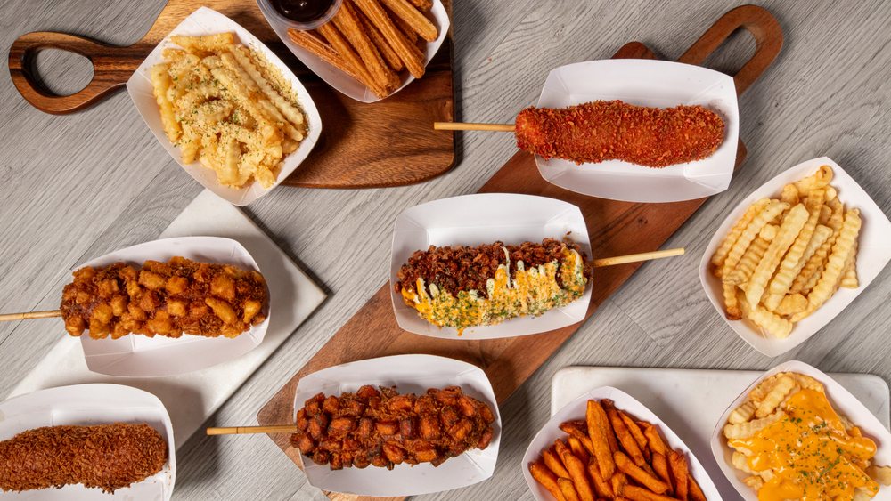A selection of Korean-style corn dogs, typically featuring sausages coated in mochi batter and bread crumbs, served in a family-sized box.