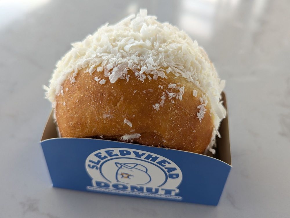 Soft donut filled with coconut milk cream, topped with shredded coconut.